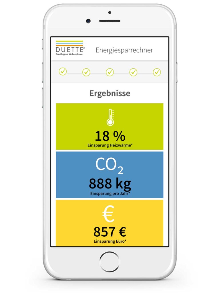 Und das Beste: Mit den DUETTE®-Wabenplissees können Sie auch nachhaltig Ihre Energiekosten senken. In Zeiten hoher Energiepreise ein unschlagbarer Vorteil! Mit dem DUETTE®-Energiesparrechner steht Ihnen dabei ein Tool zur Verfügung, mit dem Sie Ihr individuelles Einsparpotenzial an Heizenergie, Heizkosten und CO2 in wenigen Schritten berechnen können.
