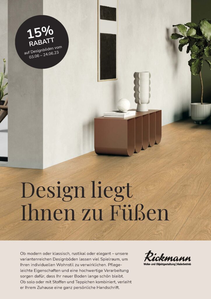 Ob modern oder klassisch, rustikal oder elegant – unsere variantenreichen Designböden lassen viel Spielraum, um Ihren individuellen Wohnstil zu verwirklichen. Pflegeleichte Eigenschaften und eine hochwertige Verarbeitung sorgen dafür, dass Ihr neuer Boden lange schön bleibt.