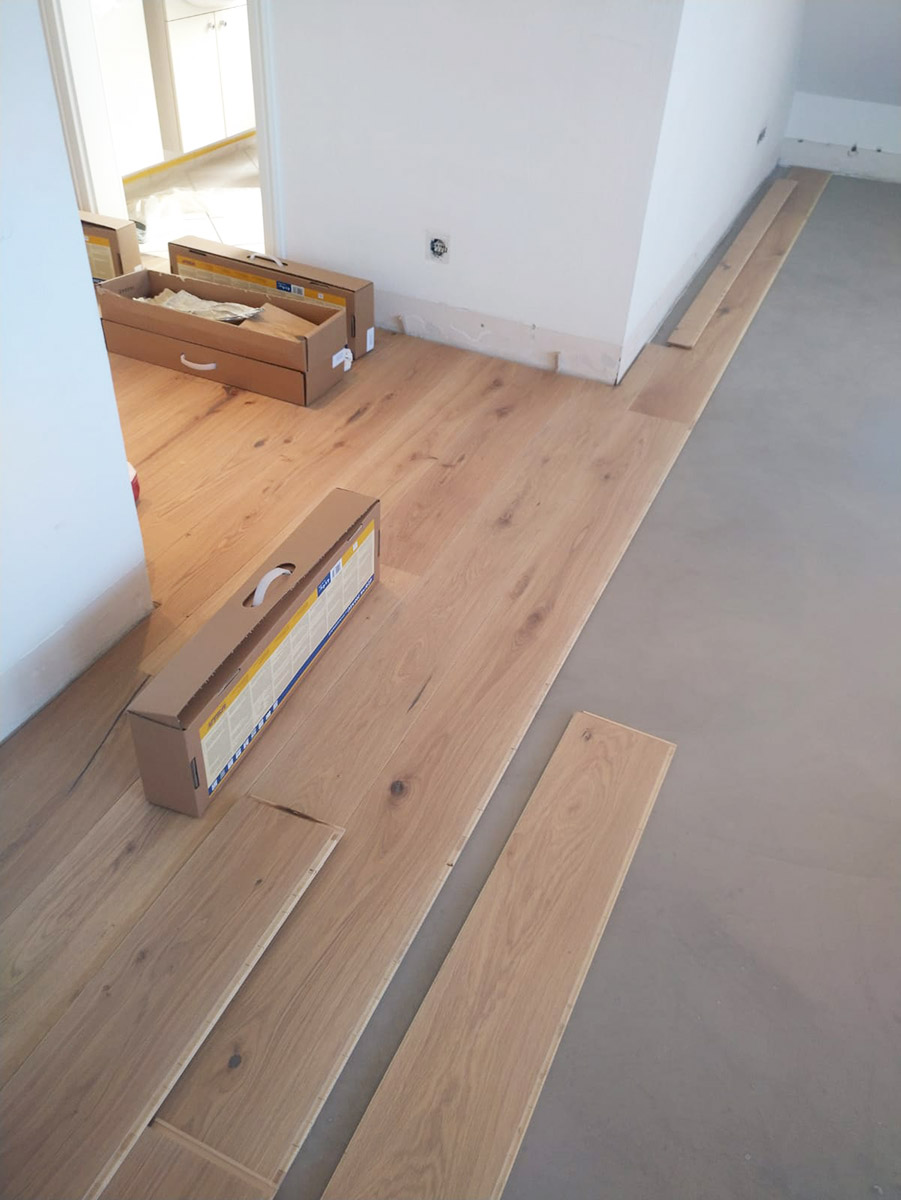 Die Kundin hatte ihre erste eigene Wohnung bezogen. Wir waren für die Verlegung des Parketts verantwortlich. Ausgewählt wurde von der Kundin der hochwertige Parkettboden „Eiche Calgary“ von Joka. Das Ergebnis unserer Arbeit kann sich, wie immer, sehen lassen.